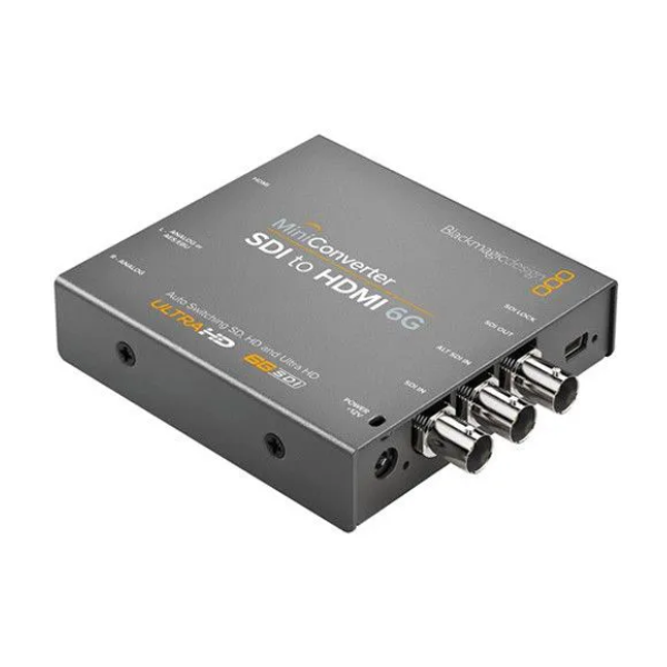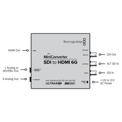 Bộ chuyển đổi có đầu vào 6G-SDI chấp nhận độ phân giải lên tới Ultra HD (3840×2160) và DCI 4K (4096×2160) và cung cấp bốn đầu nối jack âm thanh 1/4 để xuất các kênh âm thanh kỹ thuật số hoặc analog vào một màn hình âm thanh, bộ trộn, hoặc thiết bị âm thanh khác. Tín hiệu SDI xuất qua đầu nối 6G-SDI, độ phân giải, tỷ lệ khung hình phù hợp với đầu vào. Mini Converter SDI toHDMI 6G sử dụng công nghệ 6G-SDI. Mini Converter hỗ trợ độ phân giải UHD và DCI 4K lên tới 30 khung hình/giây.