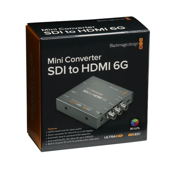 Mini Converter SDI to HDMI 6G chuyển đổi từ SDI sang HDMI ở các định dạng SD, HD và Ultra HD trong khi khử âm thanh sang HDMI, AES/EBU hoặc âm thanh analog cân bằng. Bạn cũng nhận được các tính năng nâng cao như chuyển đổi xuống để giám sát Ultra HD trên màn hình HDMI HD cũng như tích hợp LUT 3D cùng với khóa tức thời HDMI để hiển thị video tức thì khi đầu vào SDI được kết nối.
